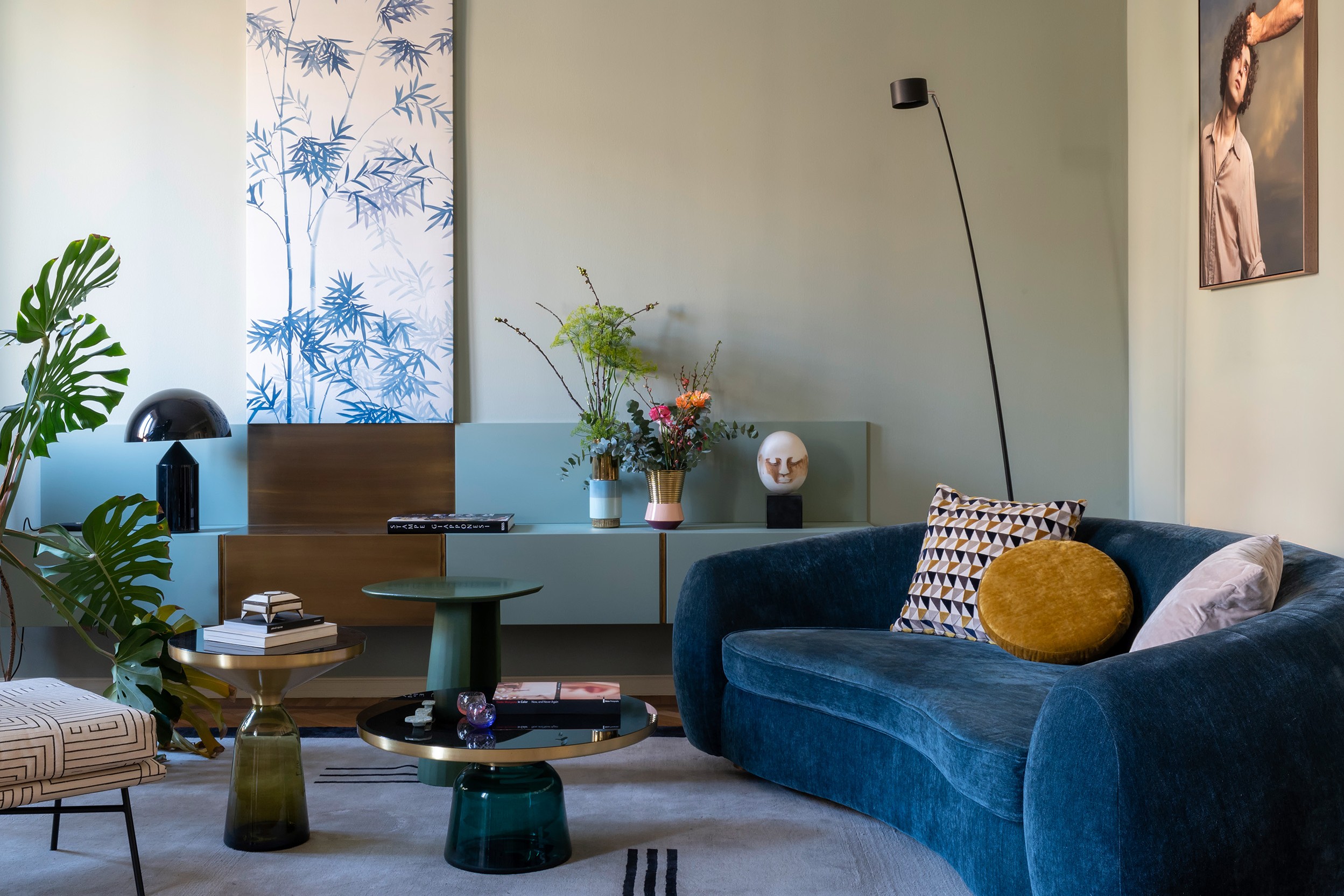 Tactile hues, a monolithic kitchen, brass details, and bespoke choices engage in dialogue with contemporary art by emerging Italian artists, composing a cultivated and deeply personal narrative.